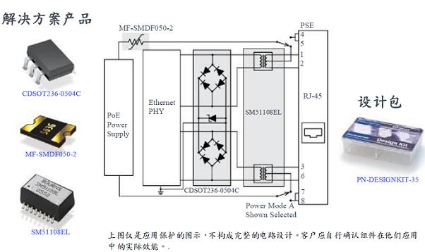 優點:本解決方案提供方案提供 ESD保護給10/100 Base-T以太網供電保護供電保護PD 組件,且不影響以太網路信號。