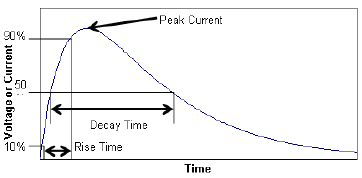 係統所經曆的電氣應力是各種各樣的: 有納秒上升時間且持續數以10計的安培電流的靜電放電(ESD)應力;有(you)微(wei)秒(miao)上(shang)升(sheng)時(shi)間(jian)且(qie)持(chi)續(xu)數(shu)以(yi)萬(wan)計(ji)的(de)安(an)培(pei)電(dian)流(liu)的(de)閃(shan)電(dian)應(ying)力(li)。對(dui)可(ke)以(yi)想(xiang)到(dao)的(de)現(xian)實(shi)世(shi)界(jie)中(zhong)的(de)每(mei)一(yi)種(zhong)應(ying)力(li)都(dou)進(jin)行(xing)產(chan)品(pin)測(ce)量(liang)是(shi)不(bu)可(ke)能(neng)的(de)。所(suo)以(yi)標(biao)準(zhun)機(ji)構(gou)製(zhi)定(ding)了(le)針(zhen)對(dui)每(mei)個(ge)特(te)定(ding)的(de)應(ying)力(li)威(wei)脅(xie)製(zhi)定(ding)了(le)專(zhuan)門(men)的(de)測(ce)試(shi)標(biao)準(zhun)。這(zhe)些(xie)標(biao)準(zhun)以(yi)電(dian)壓(ya)和(he)電(dian)流(liu)波(bo)形(xing)的(de)形(xing)式(shi)來(lai)表(biao)示(shi)應(ying)力(li)。最(zui)常(chang)見(jian)的(de)一(yi)種(zhong)應(ying)力(li)波(bo)形(xing)就(jiu)是(shi)圖(tu)示(shi)的(de)雙(shuang)指(zhi)數(shu)波(bo)形(xing)。典(dian)型(xing)的(de)電(dian)壓(ya)波(bo)型(xing)是(shi)被(bei)理(li)解(jie)成(cheng)開(kai)路(lu),而(er)典(dian)型(xing)的(de)電(dian)流(liu)波(bo)型(xing)是(shi)被(bei)理(li)解(jie)為(wei)短(duan)路(lu)。通(tong)常(chang)一(yi)個(ge)波(bo)形(xing)的(de)參(can)數(shu)包(bao)括(kuo)峰(feng)值(zhi)電(dian)壓(ya)、峰值電流、上升時間(通常是峰值時間的10%到90%)以及衰減時間(峰值時間的50%)。標(biao)準(zhun)同(tong)樣(yang)規(gui)定(ding)了(le)如(ru)何(he)把(ba)應(ying)力(li)波(bo)形(xing)應(ying)用(yong)到(dao)實(shi)際(ji)的(de)被(bei)測(ce)試(shi)的(de)設(she)備(bei)以(yi)及(ji)通(tong)過(guo)或(huo)者(zhe)未(wei)通(tong)過(guo)測(ce)試(shi)的(de)準(zhun)則(ze)。這(zhe)就(jiu)確(que)保(bao)了(le)測(ce)試(shi)結(jie)果(guo)可(ke)以(yi)被(bei)任(ren)何(he)一(yi)個(ge)做(zuo)此(ci)種(zhong)測(ce)試(shi)的(de)人(ren)重(zhong)現(xian)出(chu)來(lai),並(bing)且(qie)通(tong)過(guo)這(zhe)個(ge)測(ce)試(shi)的(de)係(xi)統(tong)可(ke)以(yi)可(ke)靠(kao)地(di)工(gong)作(zuo)。