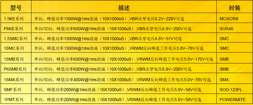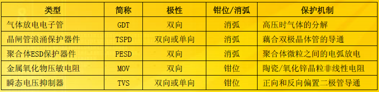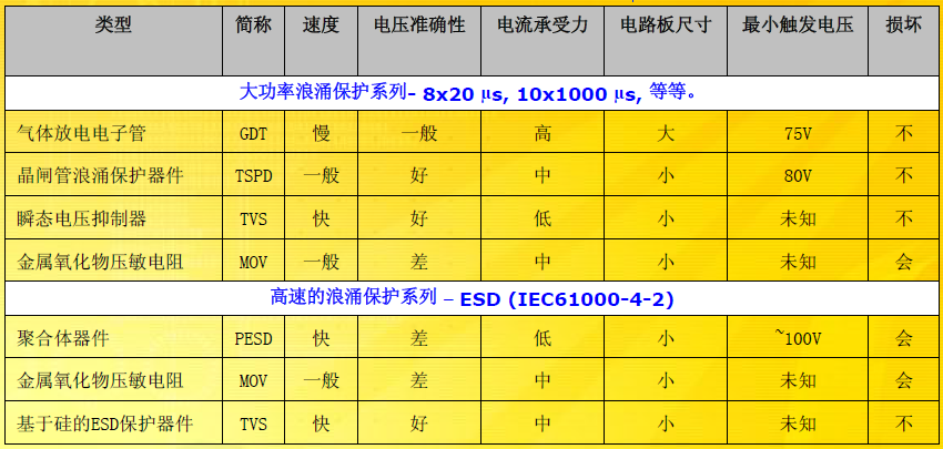 市場上有一係列對電子係統起保護作用的產品。下表簡單描述了各種產品的特征。