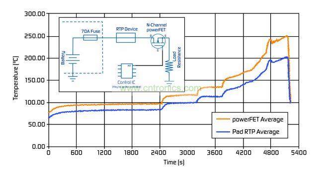 如圖4所示,當RTP器件靠近powerFET安裝時,它能夠追蹤FET溫度。當FET超過正常工作溫度極限並出現過溫情況時,RTP器件將激活,並斷開電源線路。