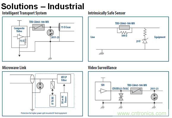 工業應用包含單線或雙線的保護,同樣非常簡單,TBU加一個氣體管,再加一個非常小的TBS。在這裏加上TBU管有什麼好處呢?因為TBS反應速度非常快,可以很快反應,TBU很快就會打通,在打通之後,打開之後所有的線路的過流和高壓都會阻絕在外麵。