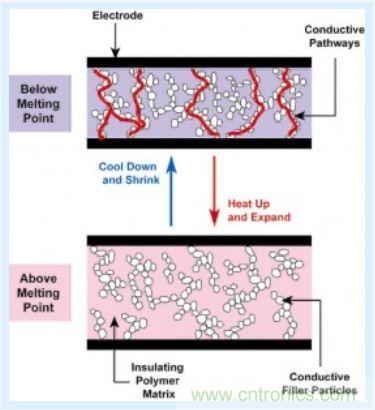 這是 PPTC 器件的工作原理,PPTC 器件是由一個由專業配方塑料和導電粒子混合而成的導電聚合物,如下圖所示,在正常溫度下,PPTC 器qi件jian中zhong的de導dao電dian粒li子zi在zai聚ju合he物wu中zhong形xing成cheng了le低di阻zu抗kang鏈lian。然ran而er,如ru果guo溫wen度du上shang升sheng到dao器qi件jian的de開kai關guan溫wen度du之zhi上shang,聚ju合he物wu中zhong的de微wei晶jing體ti就jiu會hui熔rong化hua而er成cheng為wei無wu定ding形xing狀zhuang態tai。晶jing體ti熔rong化hua過guo程cheng中zhong,體ti積ji會hui增zeng加jia,引yin起qi導dao電dian粒li子zi的de分fen離li,從cong而er導dao致zhi器qi件jian電dian阻zu呈cheng現xian非fei線xian性xing增zeng加jia。