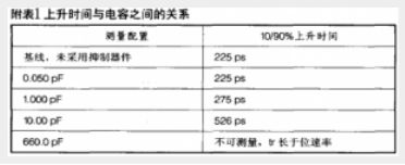 通常,USB 2.0 支持 480Mbps (bits per second) 的數據傳輸;DVI 和 HDMI 協議更是分別支持高達 8Gbps 和 5Gbps 的數據傳輸帶寬。在 USB 2.0、DVI 和 HDMI 的高速數據率下,傳統保護裝置的寄生電容可能破壞信號的完整性或令其失真。失真表現為由較慢的上升和下降時間所致的高態/低態瞬變的前沿和後沿被修圓。上升和下降時間較慢會給係統帶來一些問題,其中最重要的是時序問題。電路在特定的時間需要穩定的“高”態和“低”態。隨著各狀態之間過渡時間的增加,電路有可能檢測到不完整的過渡期,從而將數據誤差引入係統。附表1是不同寄生電容 ESD 抑製器件對數據上升沿時間 (10%至90%高電平) 所造成的影響比較。