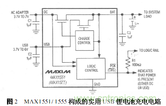 圖2是由MAX1551/1555構成的一種實用USB鋰電池充電電路。MAX1551/1555是MAXIM公司設計生產的USB單節鋰電池充電芯片,為5引腳薄型SOT23封裝,允許USB接口或者牆壁AC適配器3.7V~7V範圍的電壓輸入。芯片內部還具有溫度限製電路。