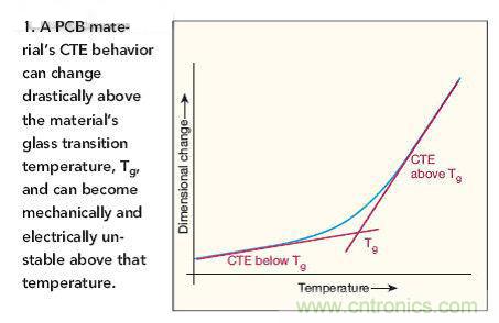 圖1:PCB材料的熱膨脹係數(CTE)特性在高於材料的玻璃化溫度Tg時會發生急劇變化,並且在機械和電氣方麵變得不穩定