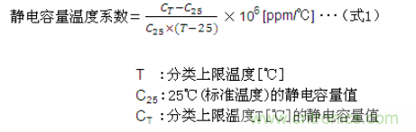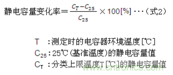 (2) 另一種是在公共標準中被歸類於Class2(種類2)的高介電常數獨石陶瓷電容器,使用了鈦酸鋇係的介電質材料,其靜電容量值對溫度呈現出不規則的變化。 因此,靜電容量-溫度特性的標準值是針對基準溫度(此處以25℃為基準)的靜電容量值C25,通過適用溫度範圍內的靜電容量變化率的最大值與最小值進行規 定。(參照式2)。