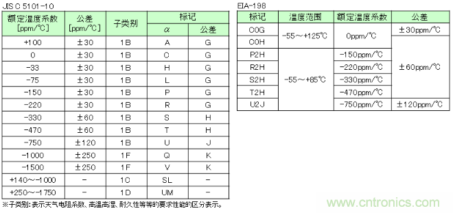 表1:溫度補償用獨石陶瓷電容器的溫度係數值和公差以及其標記