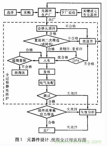 元器件使用全過程包括選擇、采購、監製、驗收、篩選(拷機)、破壞性物理分析(DPA)、保管、使用、電氣裝配、通電調試、靜電防護和失效分析等。元器件的選擇和使用全過程流程圖如圖1所示。