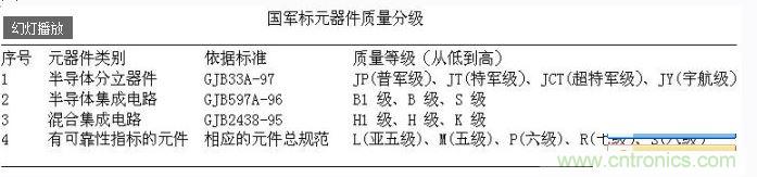 元器件的質量等級是指元器件裝機使用之前,按產品執行標準或供需雙方的技術協議,在製造、檢驗及篩選過程中對其質量的控製等級。質量等級越高,其可靠性等級就越高。