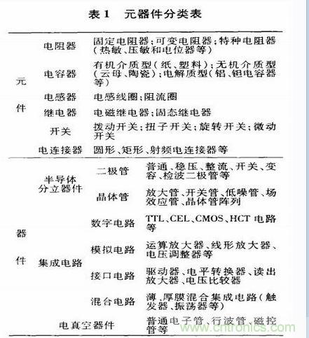 顧名思義,元器件可分為元件和器件2大類。元件中有電阻、電容、電感、繼電器和開關等;器件可分為半導體分立器件、集成電路以及電真空器件等。表1為元器件分類表。