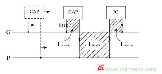 在這裏引入兩個概念:Labove 、Lbelow (電容和IC下麵的電流回路大小不一定一樣,但在這裏分析的時候,假定大小等同)