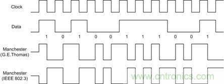 關於單線實現同步傳輸的回答是肯定的,而且這種協議的數量還不少,曼切斯特編碼(Manchester Encoding)就是其中一種,曼切斯特編碼也叫做相位編碼(PE)和雙相碼(Biphase Code)。它的編碼規則是將每個二進製碼元變換成相位不同的一個方波周期。例如,消息碼“0”對應相位,“1”對應相位0。也可以這樣理解,每一位的中間有一跳變,位中間的跳變既作為時鍾信號,又作為數據信號;從高到低跳變表示“0”,從低到高跳變表示“1”,如圖1所示,以Manchester IEEE802.3為準。在傳輸碼元信息的同時,也將時鍾同步信號一起傳輸到對方,每位編碼中有一跳變,不存在直流分量(高電平和低電平電壓相反的情況),因此具有自同步能力和良好的抗幹擾性能。小小的不足就是每一個碼元都被調製成兩個電平,所以數據傳輸的速率隻有調製速率的1/2。