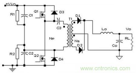 電容器C1和C2與開關管Q1、Q2組成橋,橋的對角線接變壓器T1的原邊繞組,故稱半橋變換器。如果此時C1=C2,那麼當某一開關管導通時,繞組上的電壓隻有電源電壓的一半。
