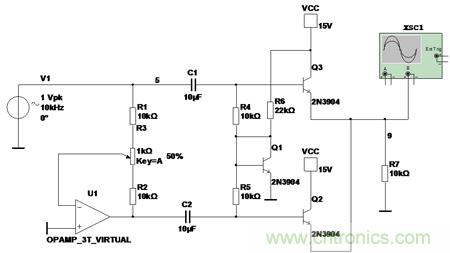 從仿真結果可以看出輸出的波形比輸入波形稍往上有個偏移。這是由於 Q1 將Q2 和 Q3 的基極電位抬高使得 Q2和Q3處於微微開啟狀態,也就是當輸入信號為0時,輸出也是稍有些電壓的。不過這個偏移很小,隻有幾十mV。對大多數的應用來說沒有太大的影響。如果對此很在意,可以適當的加大R6的阻值,R6增大,Q1的基極電流降級, 發射結壓降降低,Q2、Q3的基極靜態工作點同樣也會降低。
