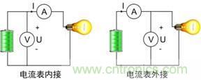 下圖分別顯示了電流表內接和外接兩種接法。