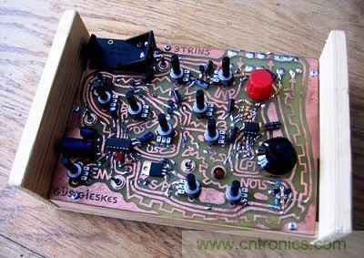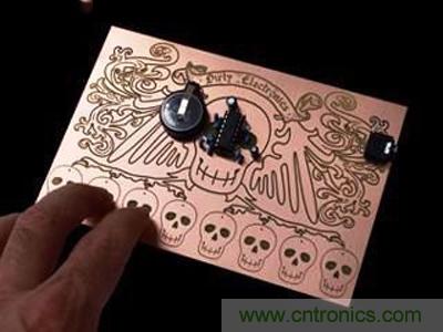 接著是跟前麵的街頭塗鴉風格完全不同的另一款迷你合成器電路板;電路板上並列的那一排骷髏是合成器的鍵盤,振蕩器(oscillator)的間距是由皮膚接觸的電平來控製。事實上,玩這個小東西的秘訣是,在開始彈奏之前先舔一舔(?!)指尖…