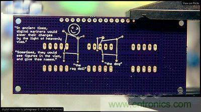 下麵是一位自稱“johngineer”的網友作品,這家夥的網站有不少很酷的東西(例如一隻他自 己做的超酷龐克風手表),還有非常專業的技術文章。“johngineer”沒有解釋這個電路板的作用,但他在上麵印了兩段文字,想象未來如果有考古學家挖到這片電路板,會怎麼解讀這種“文物”?