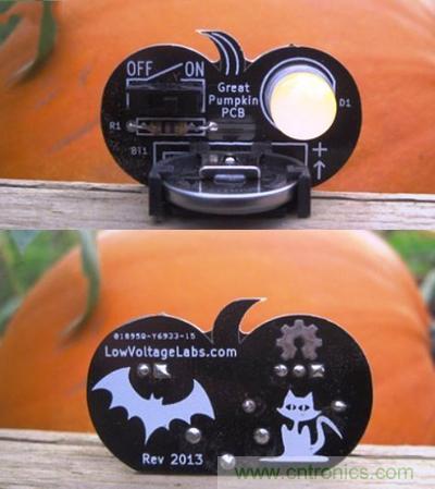 這是low voltage labs開發的南瓜PCB,除了形狀很可愛,還印了可愛的圖案;這款電路板上麵有LED燈泡,就是讓你在萬聖節放進南瓜燈,不必擔心蠟燭會被風吹熄….其實直接當成擺飾也很有味道,而且隻要6美元就買得到!