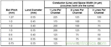 一旦完成了Dog bone型扇出,並且確定了特定的過孔焊盤尺寸,第二步就是定義從BGA進入電路板內層的走線寬度。確認走線寬度時要考慮許多因素。表1顯示了走線寬度。走線之間要求的最小空間限定了BGA迂回布線空間。重要的是要知道,減小走線之間的空間將增加電路板製造成本。