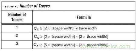 兩個過孔之間的區域被稱為走線通道。相鄰過孔焊盤之間的通道麵積是信號布線必須經過的最小麵積。表1用來計算可以經過這個區域布線的走線數量。