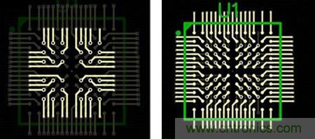 圖7a和7b:焊盤內過孔用於內部,而外部引腳在0.5mm柵格上扇出。圖7a顯示的是頂層;圖7b顯示的是頂層和內部布線層。