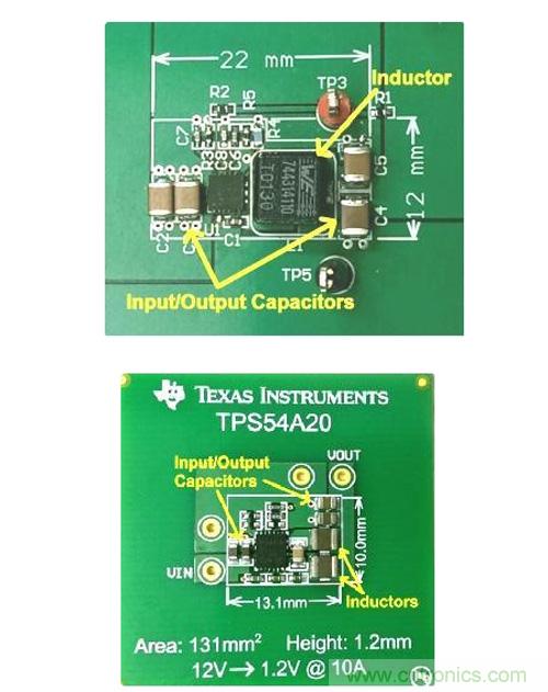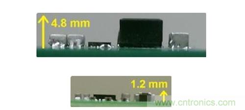 穩壓器尺寸的減小為我們提供了更多的機會。對比圖2中所示的高度剖麵圖我們可以看到,常規降壓變換器的高度為4.8毫米,然而對於背麵部件而言,這一高度遠超很多係統的高度限製。串聯電容降壓轉換器(1.2毫米高)的低斷麵可以讓您將穩壓器置於電路板背麵,這樣便可以釋放寶貴的頂側基板麵。之前將整個10A轉換器置於其背麵在之前不太現實,因為無源部件體積過大, 但如今有了TPS54A20,一切便成了可能。