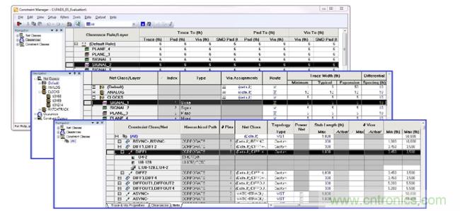 當今的關鍵高速設計異常複雜,如果沒有有效的手段來管理約束規則,則對走線、拓撲和信號延遲等方麵的設計、約(yue)束(shu)和(he)管(guan)理(li)將(jiang)會(hui)變(bian)得(de)異(yi)常(chang)困(kun)難(nan)。為(wei)了(le)在(zai)第(di)一(yi)次(ci)迭(die)代(dai)中(zhong)就(jiu)構(gou)建(jian)出(chu)成(cheng)功(gong)的(de)產(chan)品(pin),必(bi)須(xu)在(zai)設(she)計(ji)流(liu)程(cheng)的(de)早(zao)期(qi)設(she)置(zhi)約(yue)束(shu)規(gui)則(ze),以(yi)便(bian)設(she)計(ji)達(da)到(dao)要(yao)求(qiu)的(de)目(mu)標(biao)。良(liang)好(hao)的(de)約(yue)束(shu)規(gui)則(ze)管(guan)理(li)可(ke)防(fang)止(zhi)您(nin)使(shi)用(yong)價(jia)格(ge)高(gao)昂(ang)或(huo)無(wu)法(fa)采(cai)購(gou)到(dao)的(de)元(yuan)件(jian),並(bing)且(qie)最(zui)終(zhong)確(que)保(bao)電(dian)路(lu)板(ban)符(fu)合(he)性(xing)能(neng)和(he)製(zhi)造(zao)要(yao)求(qiu)。