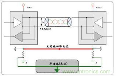 幹擾不但影響信號,更嚴重的會導致板子死機或者燒毀,所以接口和電源的隔離是抗幹擾的第一條“軍規”.隔離的主要目的是:避免地回流燒毀電路板和限製幹擾的幅度,保護控製器不死機。如圖3所示,為未隔離時,兩個節點的地電位不一致,導致有回流電流,產生共模信號,CAN的抗共模幹擾能力是-12~7V,超過這個差值則出現錯誤,如果共模差超過±36V,燒毀收發器或者電路板。