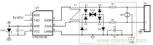 增加隔離後,是否萬事大吉了?肯定不是,隔離隻是阻擋,如果幹擾強度很高,比如達到2KV浪湧,隔離也會被破壞。所以要想達到更高的防護等級,必須增加防浪湧電路。如圖6所示,為致遠電子高速總線標準防浪湧保護電路。