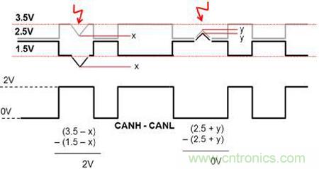CAN總線為了提高抗幹擾能力,采用CANH和CANL差分傳輸,達到效果就是遇到幹擾後,可以“同上同下”,最後CANH-CANL的差分值保持不變。如圖7所示。