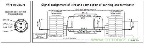帶屏蔽層的CAN線,可以良好地抵禦電場的幹擾,等於整個屏蔽層是一個等勢體,避免CAN導線受到幹擾。如圖9所示,為一個標準的屏蔽雙絞線,CANH和CANL通過鋁箔和無氧銅絲屏蔽網包裹,如圖9所示。需要注意的是和與接插件的連接,在連接部分允許有短於25 mm 的電纜不用雙絞。