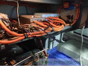 遠離幹擾源是最簡單的抗幹擾方法,如果CAN線與強電幹擾源遠離0.5米,幹擾就基本影響不到了。可是在實際布線中,經常遇到空間太小而不得不和強電混在一起,如圖12所示,為某新能源汽車的驅動係統,CAN線與驅動線混在一起,結果導致幹擾很大。隻要與CAN並行的驅動線,具備2A/秒的電流變化,就會耦合出強磁場而導致CAN線上出現幹擾脈衝。所以CAN線必須要和電流會劇烈變化的線纜遠離。比如繼電器、電磁閥、逆變器、電機驅動線等。