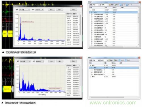磁環的效果可以大大削減特定頻率的幹擾強度,在增加磁環前,需要用CANScope或者示波器FFT快速傅裏葉變化功能,測試出最高幹擾的頻率,然後向磁環廠家定製對應頻率的磁環。如圖14所示。為增加磁環前和增加磁環後的FFT的結果。可以看出幹擾強度明顯減小。