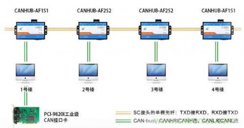 抗幹擾的終極手段就是把CAN轉化為光纖傳輸,光纖是一種無法被電磁幹擾的傳輸介質。如果前5種抗幹擾手段均無法解決幹擾問題,可以把CAN轉化為光纖,實現“無懈可擊”。如圖15所示。為使用致遠電子的CANHub-AF1S1和CANHub-AF2S2組合的光纖主幹網絡。