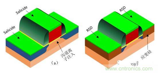 隨著MOS器件的特征尺寸不斷縮小到90nm及ji以yi下xia時shi,短duan溝gou道dao效xiao應ying中zhong的de器qi件jian亞ya閾yu值zhi電dian流liu成cheng為wei妨fang礙ai工gong藝yi進jin一yi步bu發fa展zhan的de主zhu要yao因yin素su,盡jin管guan提ti高gao溝gou道dao摻chan雜za濃nong度du可ke以yi在zai一yi定ding程cheng度du上shang抑yi製zhi短duan溝gou道dao效xiao應ying,然ran而er高gao摻chan雜za的de溝gou道dao會hui增zeng大da庫ku倫lun散san射she,使shi載zai流liu子zi遷qian移yi率lv下xia降jiang,導dao致zhi器qi件jian的de速su度du降jiang低di,所suo以yi僅jin僅jin依yi靠kao縮suo小xiaoMOS器(qi)件(jian)的(de)幾(ji)何(he)尺(chi)寸(cun)已(yi)經(jing)不(bu)能(neng)滿(man)足(zu)器(qi)件(jian)性(xing)能(neng)的(de)提(ti)高(gao),需(xu)要(yao)一(yi)些(xie)額(e)外(wai)的(de)工(gong)藝(yi)技(ji)術(shu)來(lai)提(ti)高(gao)器(qi)件(jian)的(de)電(dian)學(xue)性(xing)能(neng),例(li)如(ru)應(ying)變(bian)矽(gui)技(ji)術(shu)。應(ying)變(bian)矽(gui)技(ji)術(shu)是(shi)通(tong)過(guo)外(wai)延(yan)生(sheng)長(chang)在(zai)源(yuan)漏(lou)區(qu)嵌(qian)入(ru)應(ying)變(bian)材(cai)料(liao)使(shi)溝(gou)道(dao)發(fa)生(sheng)應(ying)變(bian),從(cong)而(er)提(ti)高(gao)載(zai)流(liu)子(zi)遷(qian)移(yi)率(lv),最(zui)終(zhong)提(ti)高(gao)器(qi)件(jian)的(de)速(su)度(du)。例(li)如(ru)NMOS的應變材料是SiC,PMOS的應變材料是SiGe。另外,隨著源漏的結深的短減小,源漏擴散區的厚度已經不能滿足形成Salicide的最小厚度要求,必須利用新技術RSD(Raise Source and Drain)技術來增加源漏擴散區的厚度。RSD技術是通過外延技術生長在源漏區嵌入應變材料的同時提高源漏擴散區的厚度。如圖1.15(b)所示,是采用應變矽和RSD技術的MOS管結構圖。