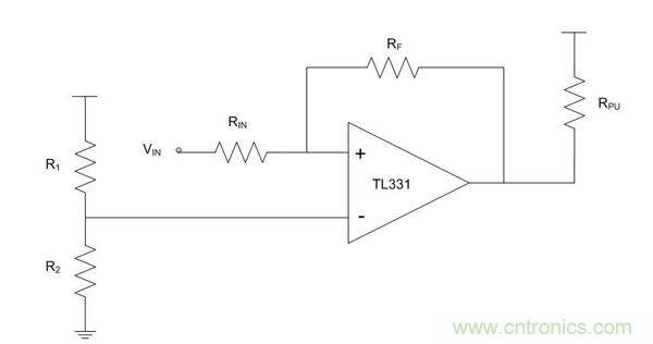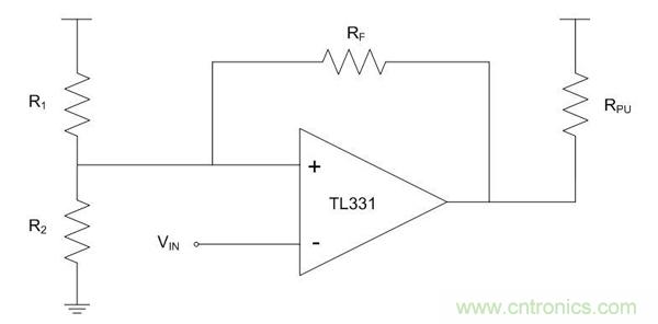 下麵的例子所示為安森美半導體TL331配置為一個反相施密特觸發器。L331是無內部滯回的單通道、低功耗、集電極開路的比較器。由R1和R2電(dian)阻(zu)創(chuang)建(jian)的(de)電(dian)阻(zu)分(fen)壓(ya)器(qi)在(zai)非(fei)反(fan)相(xiang)引(yin)腳(jiao)上(shang)設(she)置(zhi)參(can)考(kao)電(dian)壓(ya),在(zai)比(bi)較(jiao)器(qi)輸(shu)出(chu)開(kai)關(guan)處(chu)設(she)置(zhi)閾(yu)值(zhi)電(dian)壓(ya)。由(you)於(yu)這(zhe)是(shi)一(yi)個(ge)集(ji)電(dian)極(ji)開(kai)路(lu)的(de)比(bi)較(jiao)器(qi),所(suo)以(yi)連(lian)接(jie)一(yi)個(ge)上(shang)拉(la)電(dian)阻(zu)到(dao)輸(shu)出(chu)。反(fan)饋(kui)電(dian)阻(zu)通(tong)過(guo)正(zheng)反(fan)饋(kui)增(zeng)加(jia)滯(zhi)回(hui)。通(tong)常(chang)情(qing)況(kuang)下(xia),使(shi)用(yong)一(yi)個(ge)比(bi)較(jiao)大(da)的(de)反(fan)饋(kui)電(dian)阻(zu)值(zhi),至(zhi)少(shao)100 KΩ。