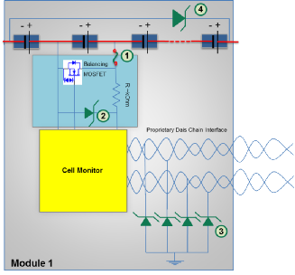 ·更多的控製器模塊的增加以及對簡化車輛中的通信網絡(也可以減少電纜的數量,從而降低總重量)的希望推動了對更大帶寬的需求。無論選擇哪種通信方案,雙通道和四通道低電容 ESD 陣列都可以用來提供所需的保護。