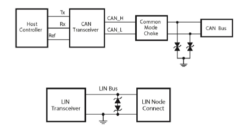 下圖所示的是 CAN 和 LIN 總線的典型 ESD 保護方案。由於 CAN 總線是雙通道電路,最常見的解決方案是采用一個雙通道二極管陣列。LIN 總線為單通道,因此它的 ESD 解決方案采用的是分立 ESD 二極管或多層壓敏電阻。