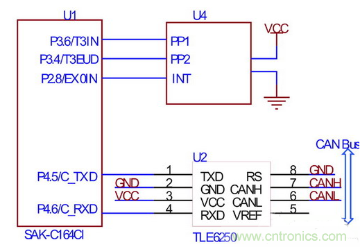 C164CI 與方向盤轉角傳感器的接口電路如圖2所示。片內內置增量編碼的正交解碼器,該解碼器使用定時器3的兩個引腳(T3IN、T3EUD)作為正交脈衝的輸入,在正確設置相關寄存器後,定時器3的數據寄存器的值與方向盤轉角成正比,故可方便的計算轉角,本文所使用的方向盤轉角傳感器每一圈對應44個脈衝,設定時器3的數據寄存器為T3,則絕對轉角為。