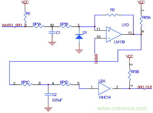 電路采用兩級濾波和整形,以保證輪速信號在極低轉速下不會丟失,同時避免因懸架振動引起的信號幹擾。圖中由電阻R2引入第一級遲滯比較,而使用74HC14引入第二級遲滯比較。