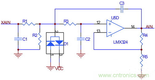根據前麵部分介紹的輪速傳感器信號特點,設計接口電路如圖3所示。