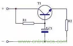 圖22中,C1可選擇幾十微法到幾百微法;R1可選擇幾百歐到幾千歐,具體取值可根據T1的β值確定,β值高,R可取值稍大,隻要保證T1的集電極-發射極電壓(UCE)大於1.5V即可。T1選擇時要注意耗散功率PCM必須大於UCEI,如果工作時發熱較大則需要增加散熱片。