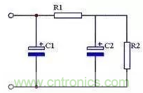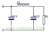 使用兩個電容和一個電阻組成RC濾波電路,又稱π型RC濾波電路。見圖20所示。這種濾波電路由於增加了一個電阻R1,使交流紋波都分擔在R1上。R1和C2越大濾波效果越好,但R1過大又會造成壓降過大,減小了輸出電壓。一般R1應遠小於R2。