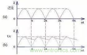 電容濾波電路圖見圖17,電容濾波電路是利用電容的充放電原理達到濾波的作用。在脈動直流波形的上升段,電容C1充電,由於充電時間常數很小,所以充電速度很快;在脈動直流波形的下降段,電容C1放電,由於放電時間常數很大,所以放電速度很慢。在C1還沒有完全放電時再次開始進行充電。這樣通過電容C1的反複充放電實現了濾波作用。濾波電容C1兩端的電壓波形見圖18。