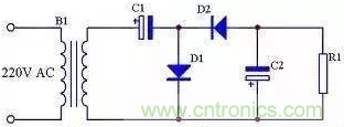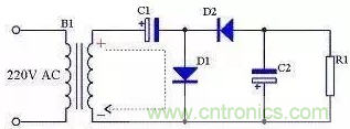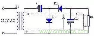 qianmianjieshaodesanzhongzhengliudianlushuchudianyadouxiaoyushurujiaoliudianyadeyouxiaozhi,ruguoxuyaoshuchudianyadayushurujiaoliudianyayouxiaozhishikeyicaiyongbeiyadianlu,jiantu12。由圖13可知,在電源的正半周,變壓器B1次級上端為正下端為負,D1導通,D2截止,C1通過D1充電,充電後C1兩端電壓接近B1次級電壓峰值,方向為左端正右端負;由圖14可知,在電源的負半周,變壓器B1次級上端為負下端為正,D1截止,D2導通,C2通過D1充電,充電後C2兩端電壓接近C1兩端電壓與B1次級電壓峰值之和,方向為下端正上端負。由於負載R1與C1並聯,當R1足夠大時,R1兩端的電壓即為接近2倍B1次級電壓。