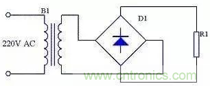設B1次級電壓為E,理想狀態下負載R1兩端的電壓可用下麵的公式求出: