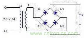由於半波整流電路的效率較低,於是人們很自然的想到將電源的負半周也利用起來,這樣就有了全波整流電路。全波整流電路圖見圖4。相對半波整流電路,全波整流電路多用了一個整流二極管D2,變壓器B1的次級也增加了一個中心抽頭。這個電路實質上是將兩個半波整流電路組合到一起。在0~π期間B1次級上端為正下端為負,D1正向導通,電源電壓加到R1上,R1兩端的電壓上端為正下端為負,其波形如圖5所示,其電流流向如圖6所示;在π~2π期間B1次級上端為負下端為正,D2正向導通,電源電壓加到R1上,R1兩端的電壓還是上端為正下端為負,其波形如圖5所示,其電流流向如圖7所示。在2π~3π、3π~4π等後續周期中重複上述過程,這樣電源正負兩個半周的電壓經過D1、D2整流後分別加到R1兩端,R1上得到的電壓總是上正下負,其波形如圖5所示。