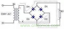 由圖9可以看出在電源正半周時,B1次級上端為正,下端為負,整流二極管D4和D2導通,電流由變壓器B1次級上端經過D4、R1、D2回到變壓器B1次級下端;由圖10可以看出在電源負半周時,B1次級下端為正,上端為負,整流二極管D1和D3導通,電流由變壓器B1次級下端經過 D1、R1、D3回到變壓器B1次級上端。R1兩端的電壓始終是上正下負,其波形與全波整流時一致。