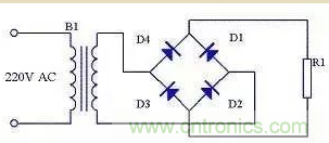 由(you)於(yu)全(quan)波(bo)整(zheng)流(liu)電(dian)路(lu)需(xu)要(yao)特(te)製(zhi)的(de)變(bian)壓(ya)器(qi),製(zhi)作(zuo)起(qi)來(lai)比(bi)較(jiao)麻(ma)煩(fan),於(yu)是(shi)出(chu)現(xian)了(le)一(yi)種(zhong)橋(qiao)式(shi)整(zheng)流(liu)電(dian)路(lu)。這(zhe)種(zhong)整(zheng)流(liu)電(dian)路(lu)使(shi)用(yong)普(pu)通(tong)的(de)變(bian)壓(ya)器(qi),但(dan)是(shi)比(bi)全(quan)波(bo)整(zheng)流(liu)多(duo)用(yong)了(le)兩(liang)個(ge)整(zheng)流(liu)二(er)極(ji)管(guan)。由(you)於(yu)四(si)個(ge)整(zheng)流(liu)二(er)極(ji)管(guan)連(lian)接(jie)成(cheng)電(dian)橋(qiao)形(xing)式(shi),所(suo)以(yi)稱(cheng)這(zhe)種(zhong)整(zheng)流(liu)電(dian)路(lu)為(wei)橋(qiao)式(shi)整(zheng)流(liu)電(dian)路(lu)。