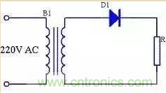 半波整流電路見下圖。其中B1是電源變壓器,D1是整流二極管,R1是負載。B1次級是一個方向和大小隨時間變化的正弦波電壓,波形如圖2所示。0~π期間是這個電壓的正半周,這時B1次級上端為正下端為負,二極管D1正向導通,電源電壓加到負載R1上,負載R1中有電流通過;π~2π期間是這個電壓的負半周,這時B1次級上端為負下端為正,二極管D1反向截止,沒有電壓加到負載R1上,負載R1中沒有電流通過。在 2π~3π、3π~4π等後續周期中重複上述過程,這樣電源負半周的波形被“削”掉,得到一個單一方向的電壓,波形如圖3所示。由於這樣得到的電壓波形大小還是隨時間變化,我們稱其為脈動直流。